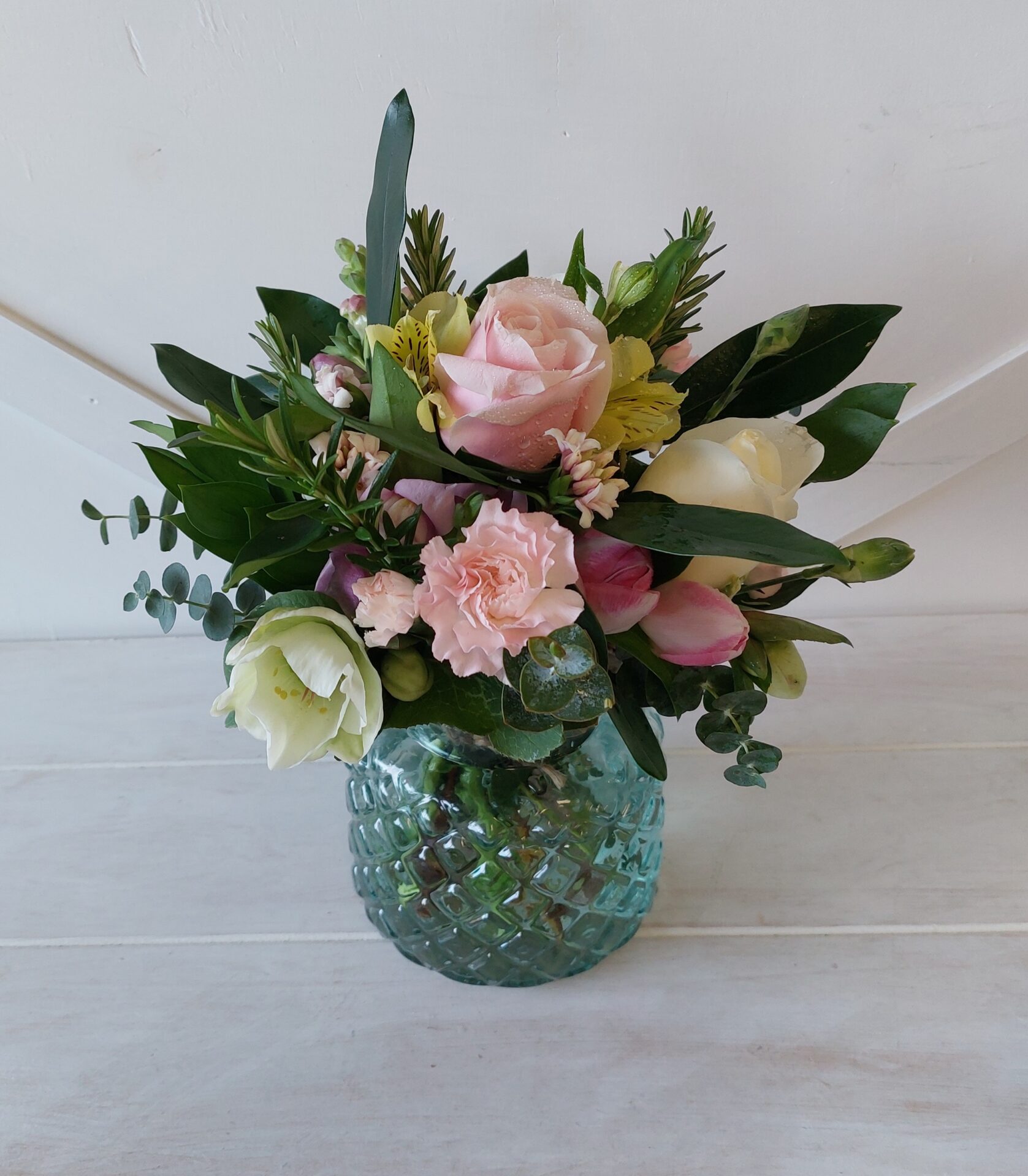 A darling posy in vase or jar, perfect for bedside table or office desk, may include roses, freesias, spray carnations.Too cute!