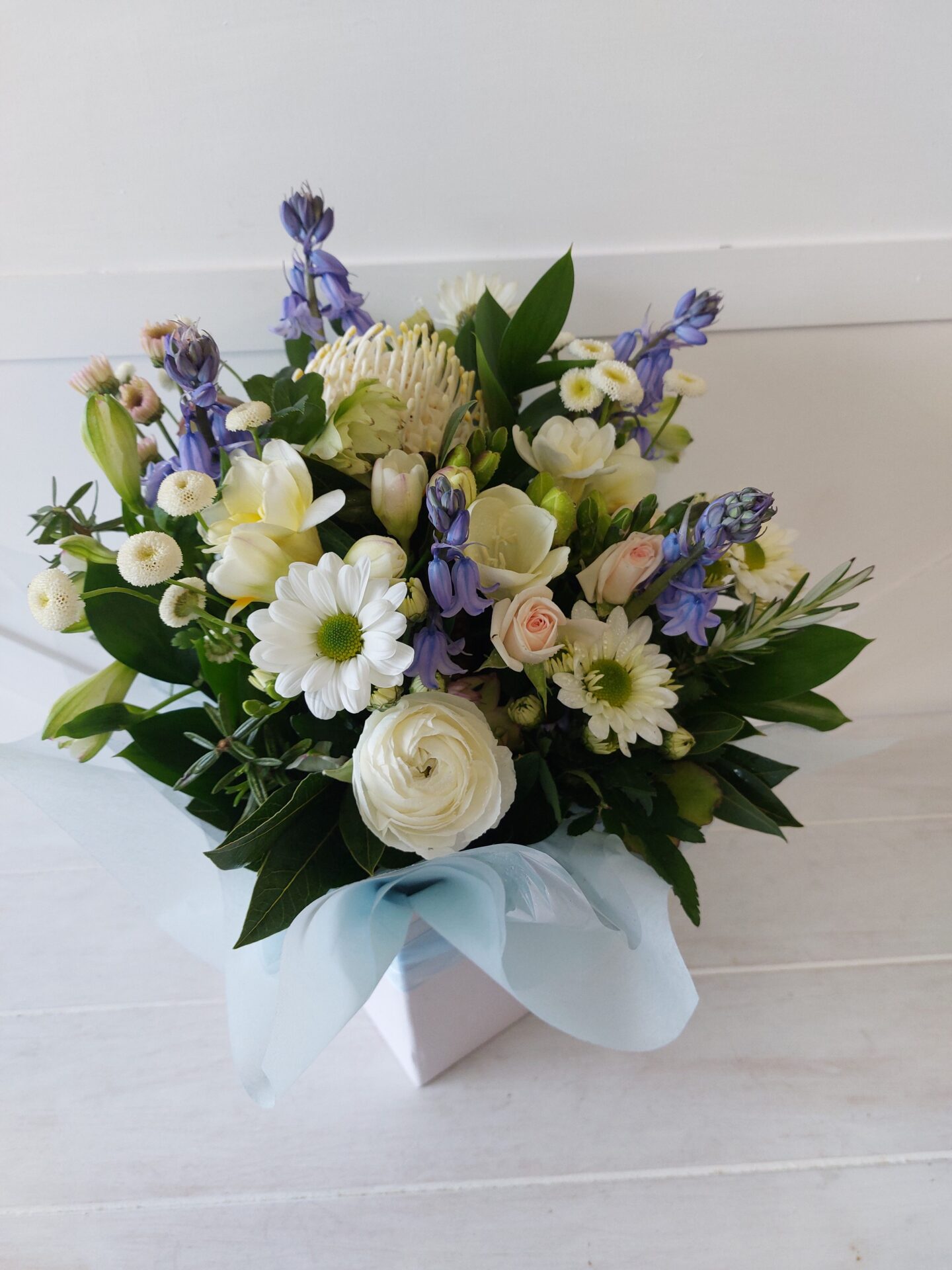 Delicate blue and white flowers which feature roses or lizyanthus, arranged in a pastel box for easy care, very sweet.
