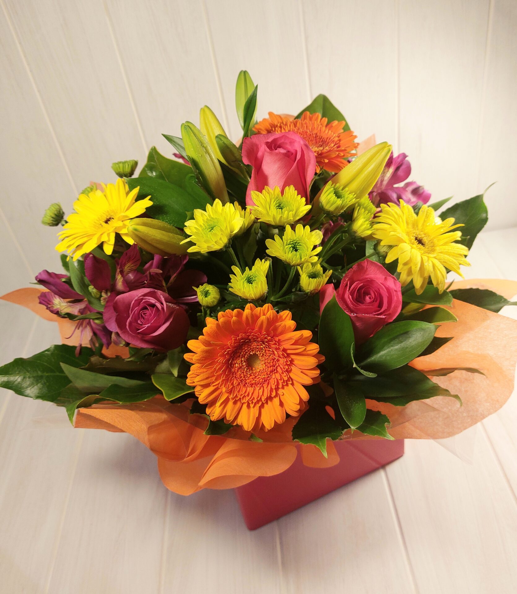 A perfect cheery boxed arrangement sure to put a smile on someone’s face. Flowers may include roses, spray chrysanths, gerberas and lilies. Good choice