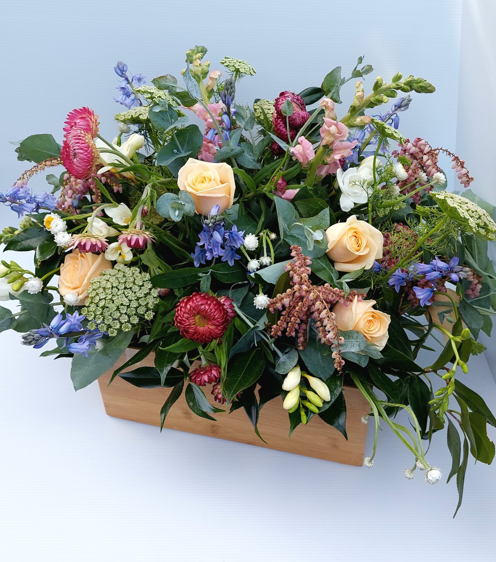 Loving this wildy arrangement of seasonal cottage style blooms and foliages in wooden box or crate, smells divine.