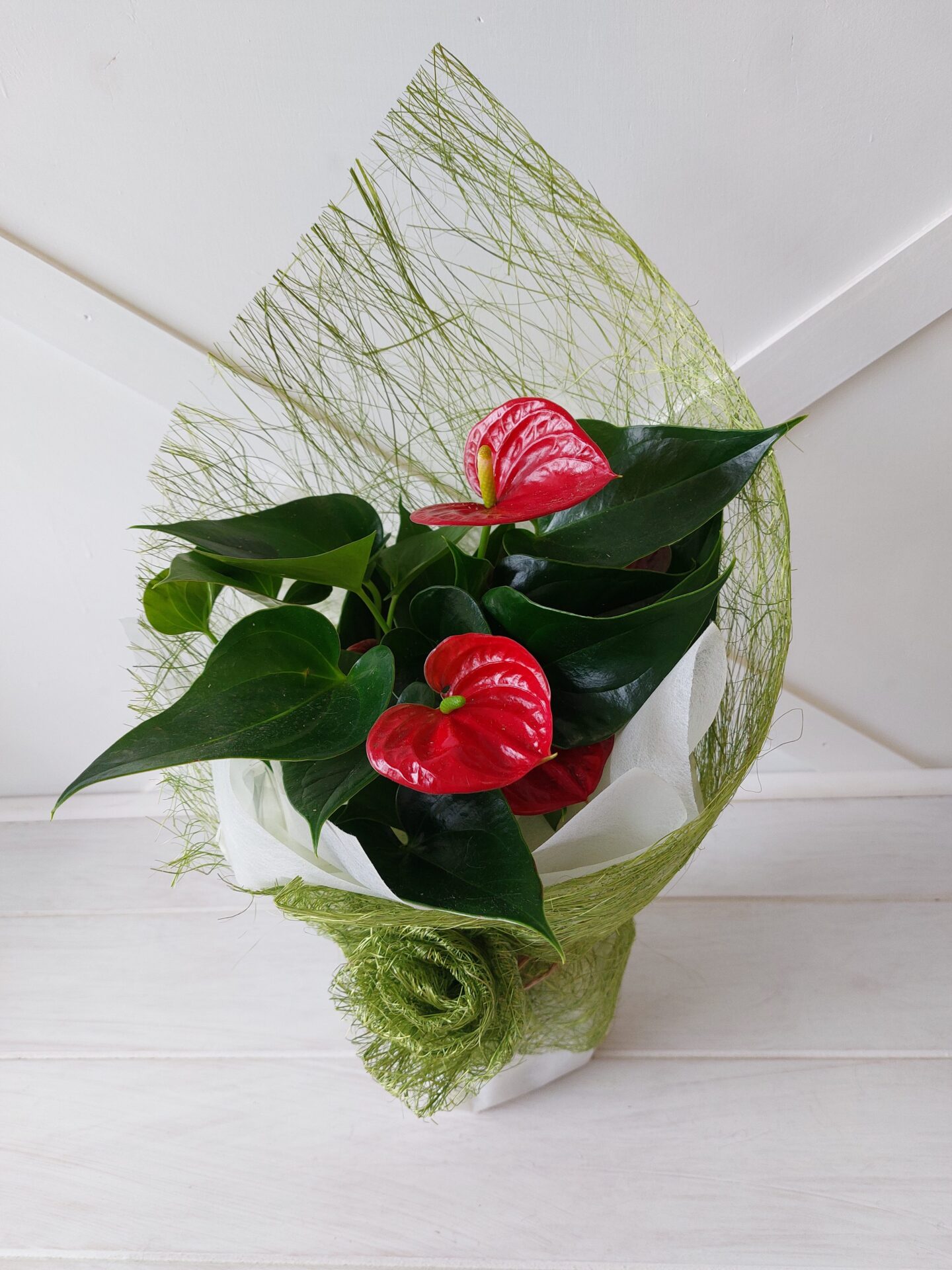 Anthurium or Bromeliad plant gift wrapped, perfect long lasting gift for home or office.
