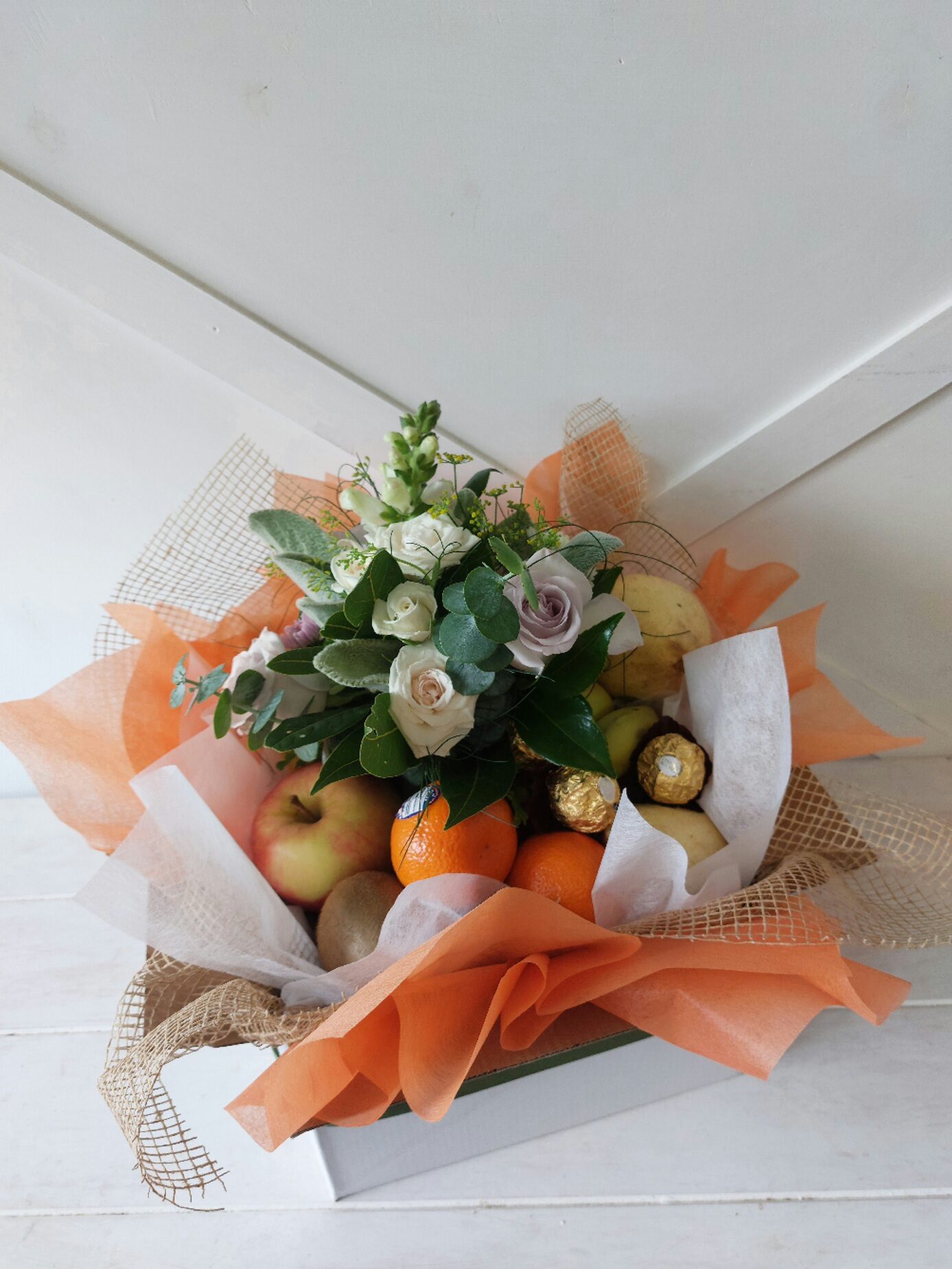 Perfect for hospital, home, or rest home, this boxed fruit display also has a few chocolates and a posy to match.