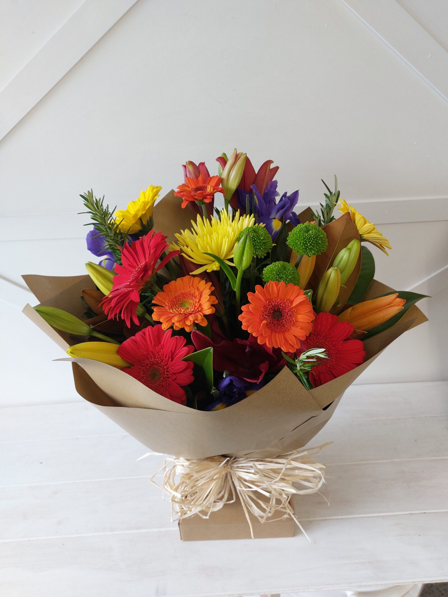 Send some cheer with this box of brightness, arranged in a kraft paper box for easy care these gerberas and lilies make a striking display to light up the room.