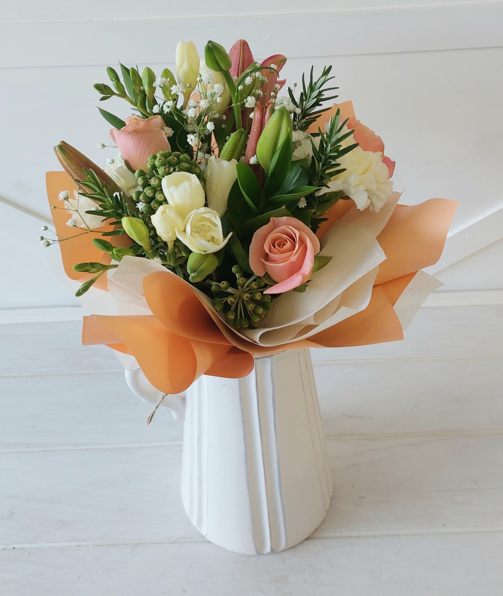 Such a pretty combination, peachy florals arranged in a cream jug, a keepsake to have when the flowers are gone. Nice.