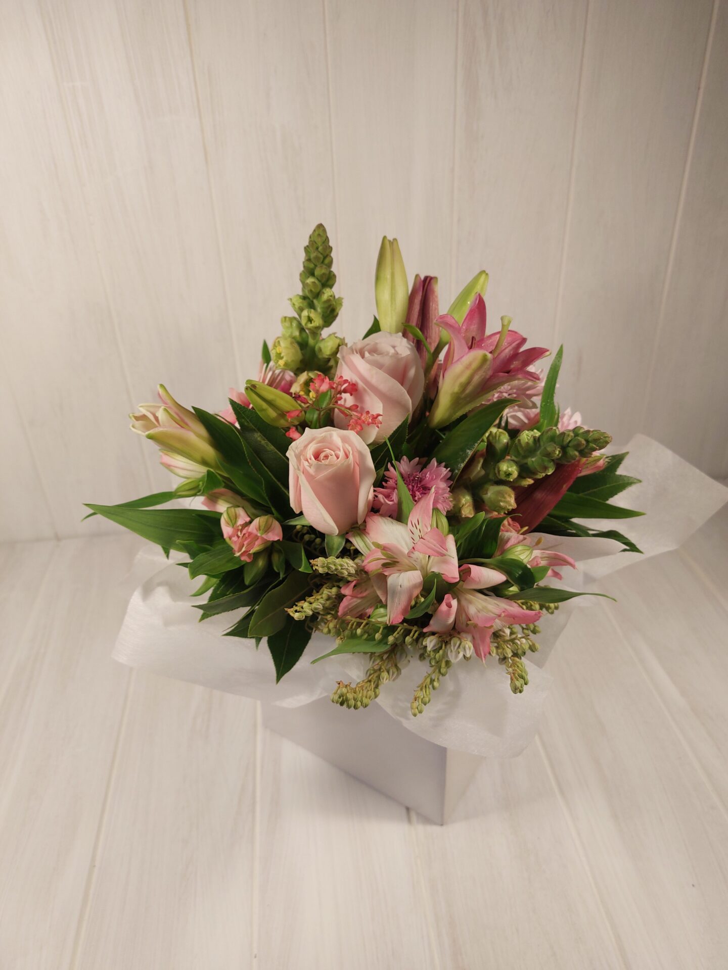 So sweet this one. Pretty pink roses feature in this compact boxed design. Perfect for a bedside table, not too big and low in fragrance. In floral foam for easy care.