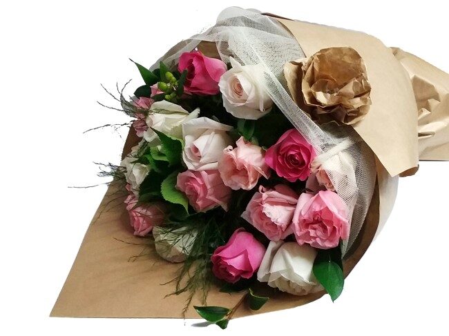 Best quality long stemmed roses and greenery all tied together in a glorious bouquet and swathed in firm paper wrap.