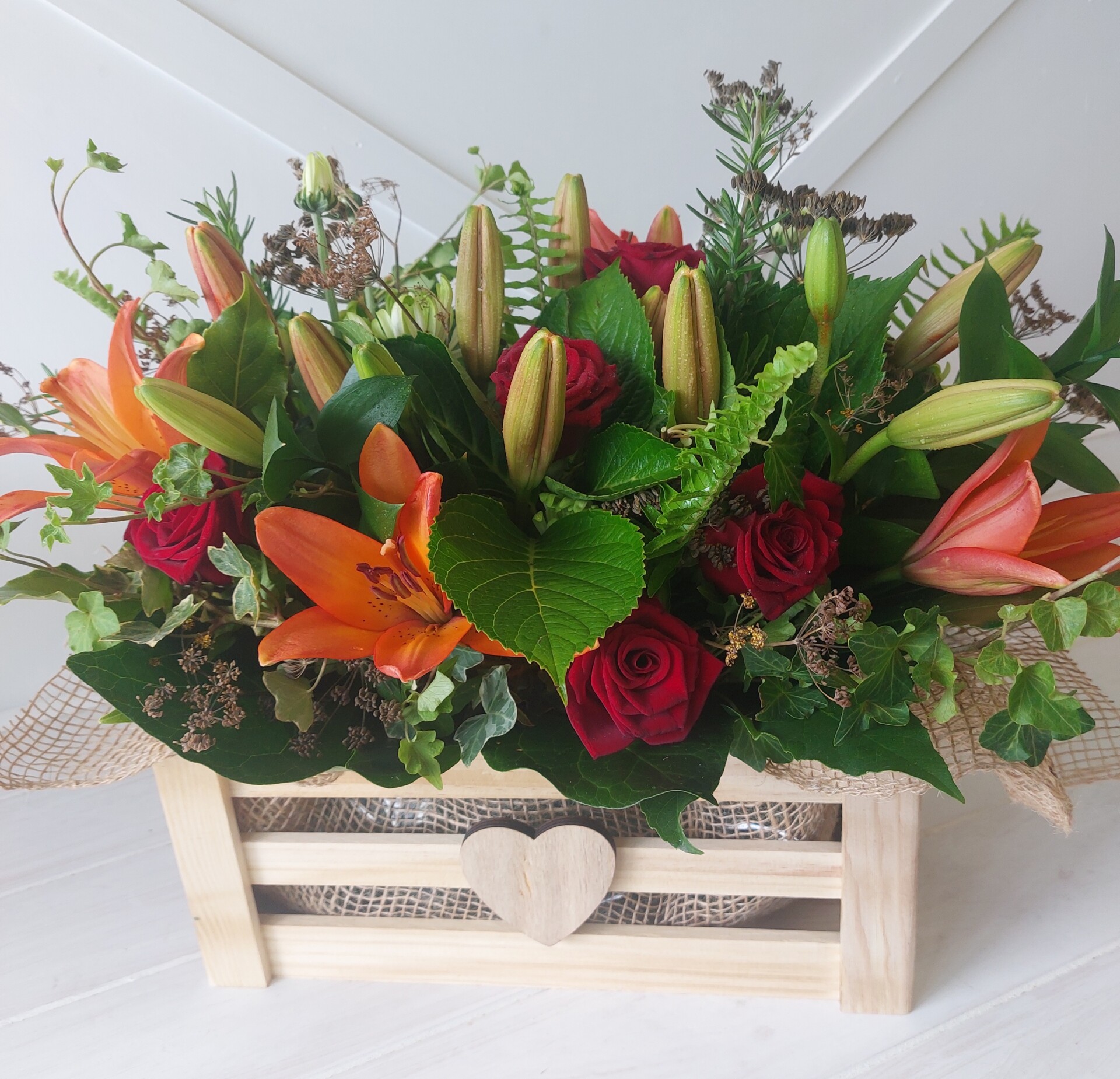 Rustic boxed arrangement staged in a wooden crate in red and rust tones. Includes a wooden heart detail for a nice wee touch.