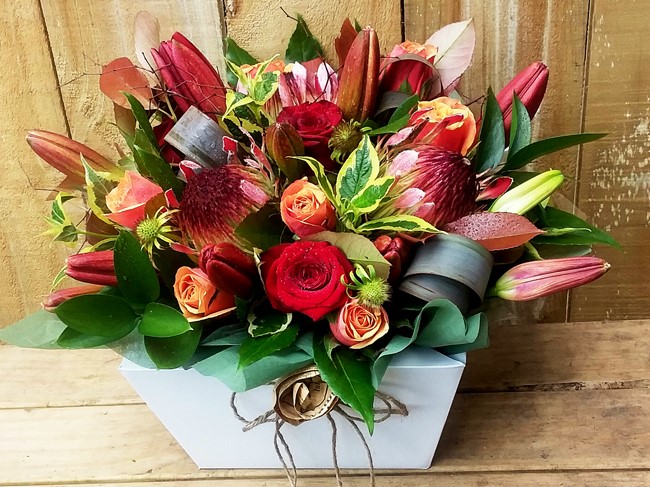 A boxed design for easy care. Long lasting featuring florals in tones of rust, peach and red plus a brown paper flower detail for finish. May include roses, lilies and protea. Really popular this one!